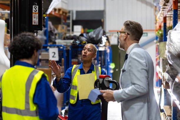 Medium shot of two warehouse workers helping a male antique dealer find a certain antique in the back of an auction warehouse. They are both wearing blue jumpsuits and yellow high-visibility jackets. They are surrounded by various antiques while the woman is pointing. It has The antique dealer is holding an electronic tablet. Videos are available similar to this scenario.